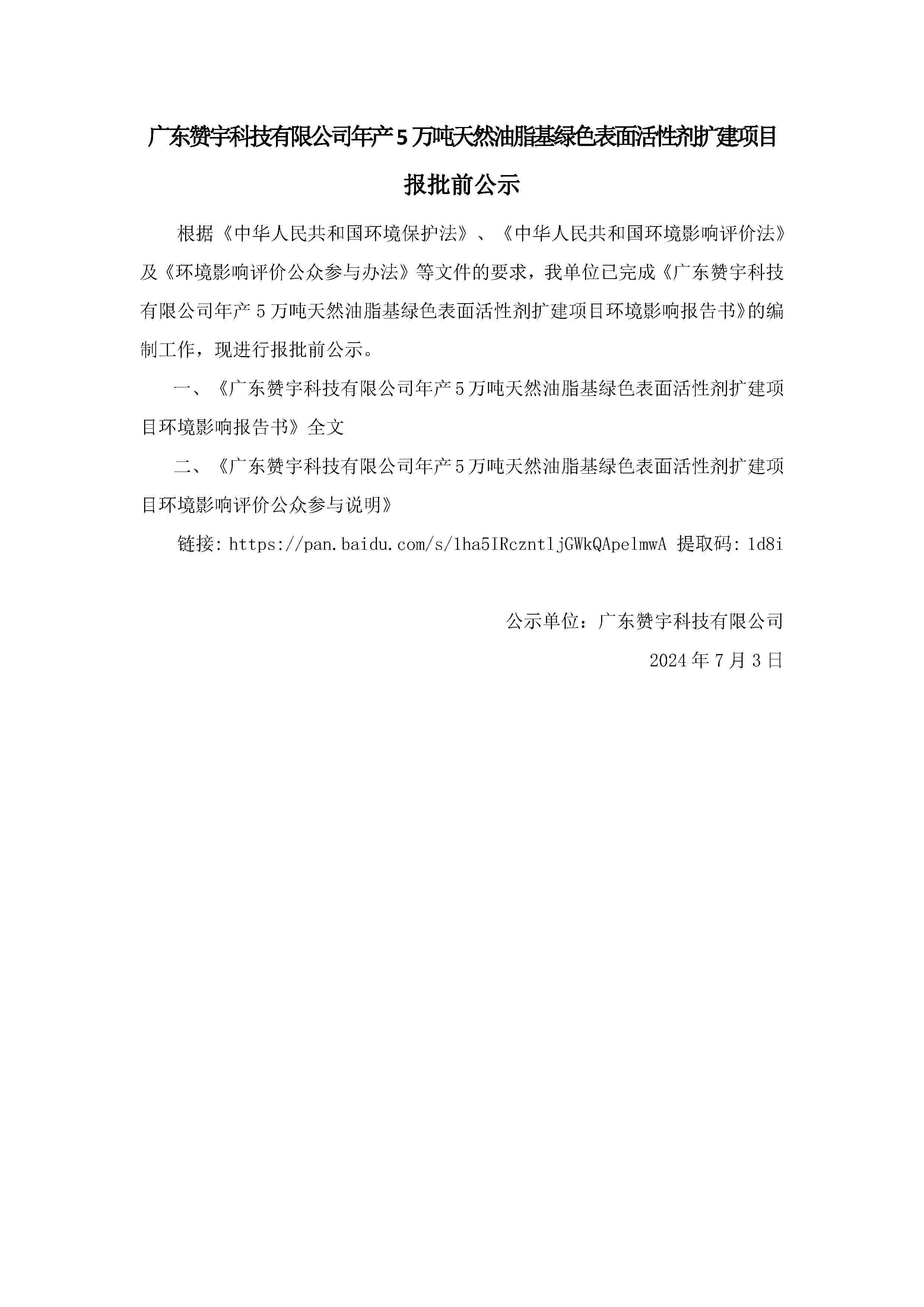 廣東贊宇科技有限公司年產(chǎn)5萬噸天然油脂基綠色表面活性劑擴(kuò)建項(xiàng)目報(bào)批前公示
